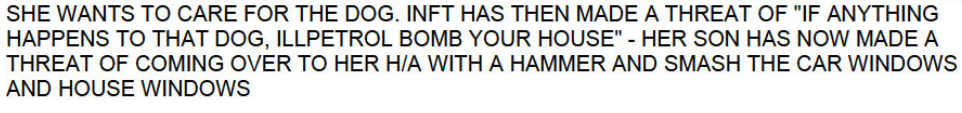 She has repeatedly threatened to seek an “order” against me. However, she’s mistaken if she believes a court order would be appropriate, given that much of the relevant history is already documented within care records disclosed to me. There is also a more recent threat that is recorded verbatim within disclosed care and risk documentation below.